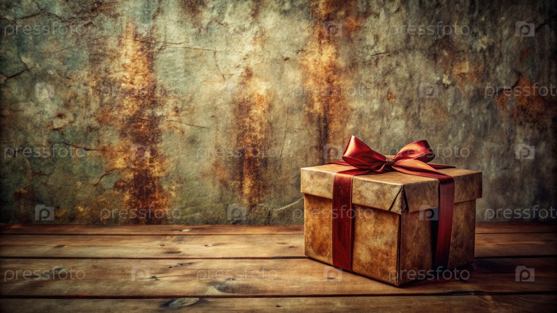 Подарочная коробка с напряженной текстурой сидит на деревянном полу на фоне грэнджа
