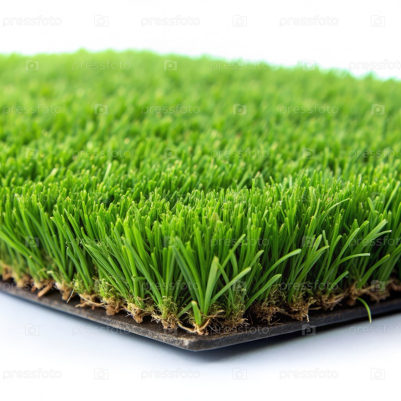 Искусственный газон отображается на белом фоне студии, чтобы продемонстрировать его пышную зеленую текстуру и универсальность для различных приложений и рекреационных мероприятий
