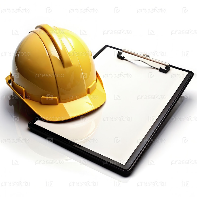 Шлем инженера и клипборд на рабочем месте для планирования проекта