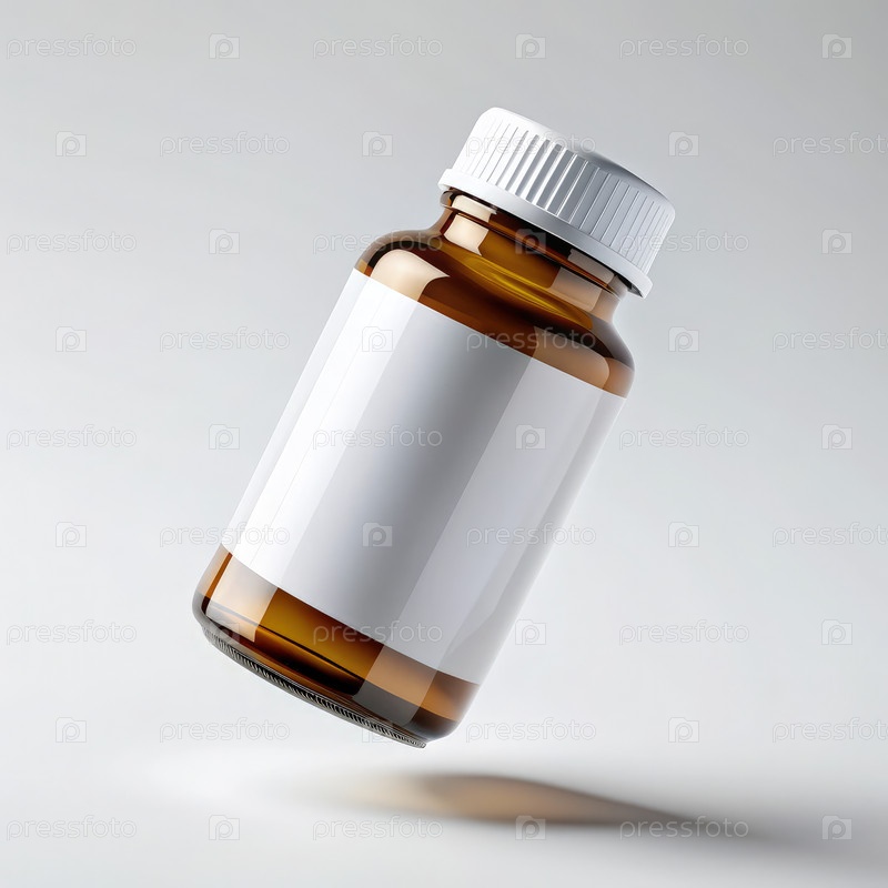 Небольшая пустая стеклянная бутылка с белым ярлыком на нейтральном фоне