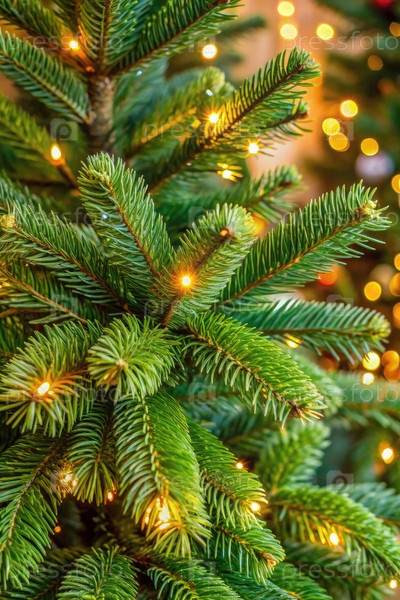 Роскошные зеленые ветви рождественской елки украшены теплыми белыми огнями во время праздничного сезона