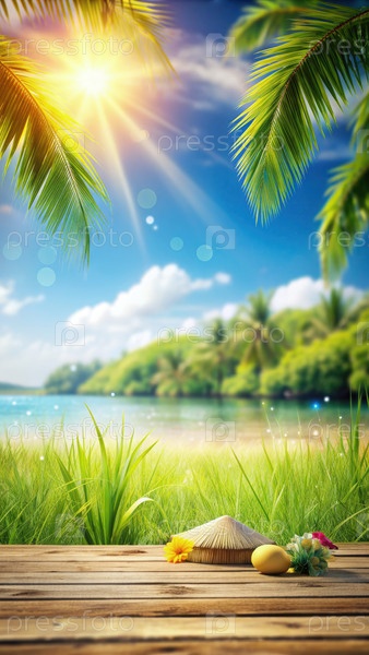 Спокойный летний день у берега с пышными пальмами и яркой зеленью