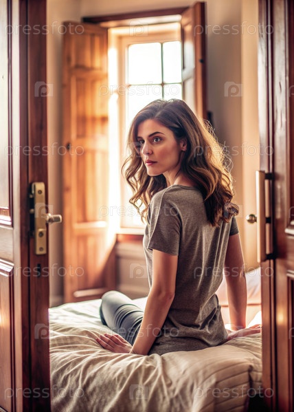 Женщина сидит на своей кровати, оглядываясь через дверь в мягком солнечном свете