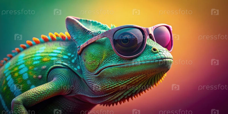 Хамелеон, носящий солнцезащитные очки на красочном градиентном фоне