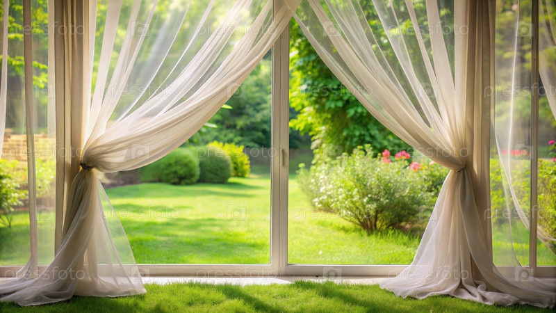 Занавески плачут нежно от открытого окна с видом на пышный сад в полуденном свете