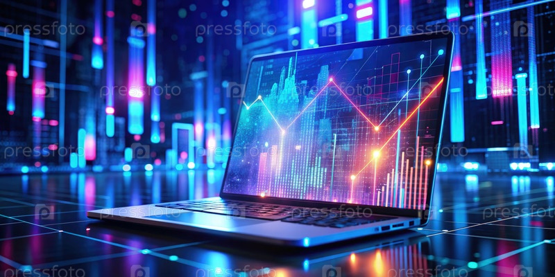 Светящаяся визуализация цифровых данных на экране ноутбука в темной среде ночью