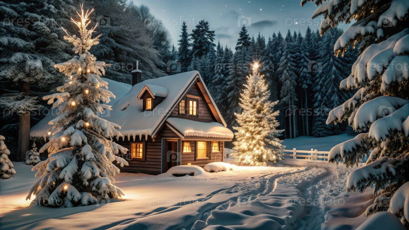 Уютная хижина, окруженная снежными деревьями в зимнюю ночь