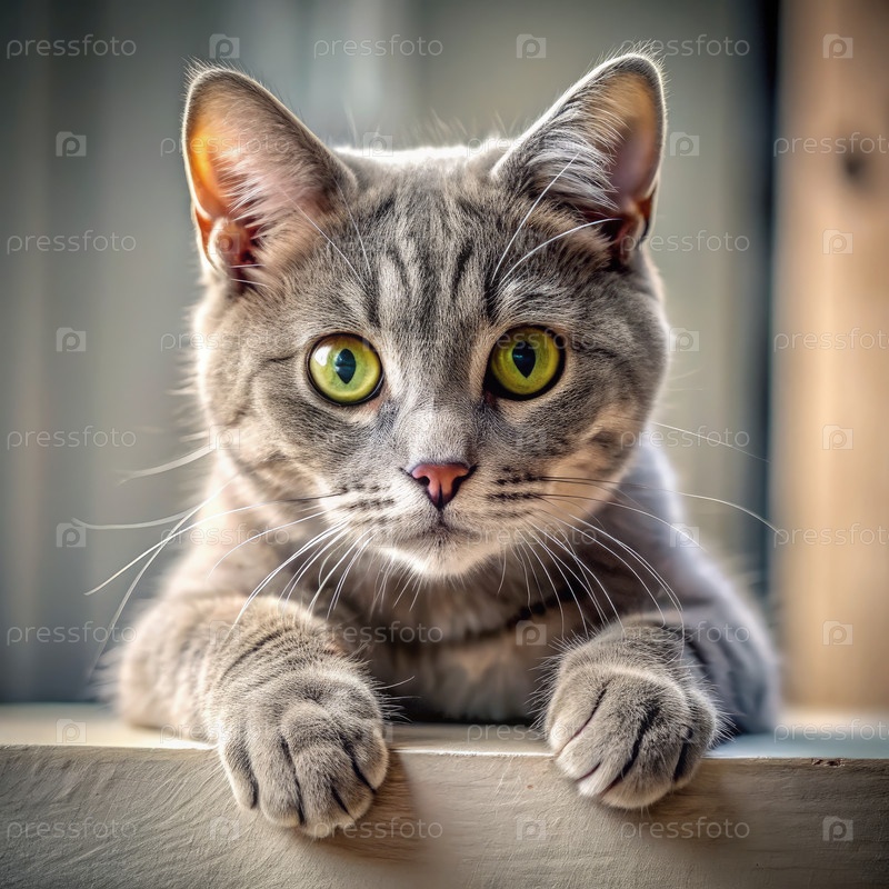 Милый серый кот подглядывает и протягивает лапу через окно в дневное время