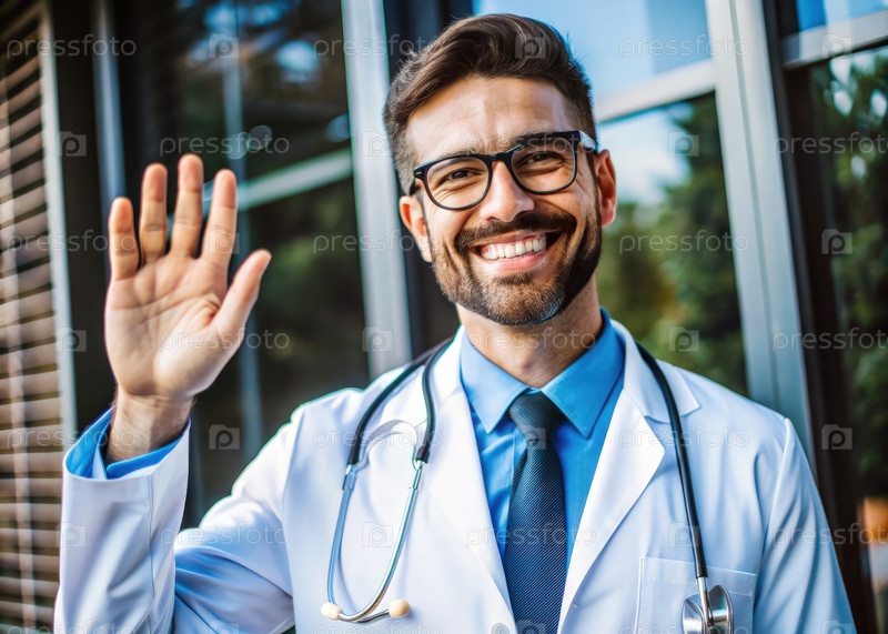 Доктор, улыбающийся и машущий снаружи клиники во время солнечного дня