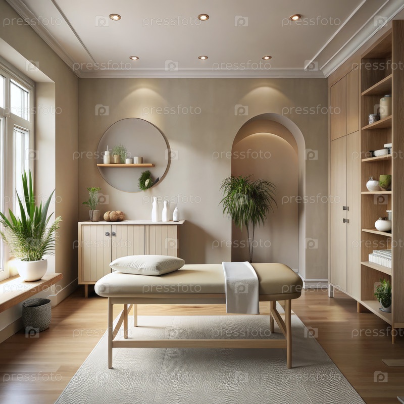 Спокойная массажная комната с мягкой приглушенной палитрой и естественным декором