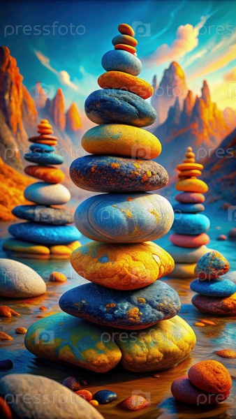Накопленные цветными камнями при закате солнца в спокойном пейзаже