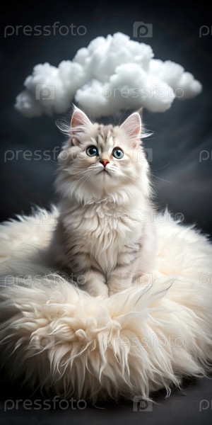 Пушистый круглый кот, сидящий на мягком белом ковре под пушистым облаком в уютной комнате