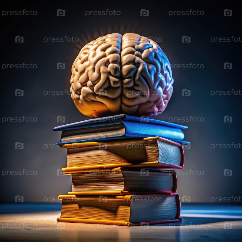 Цифровое художественное изображение человеческого мозга, сидящего на куче красочных книг, символизирующих образование и знания в творческом масштабе