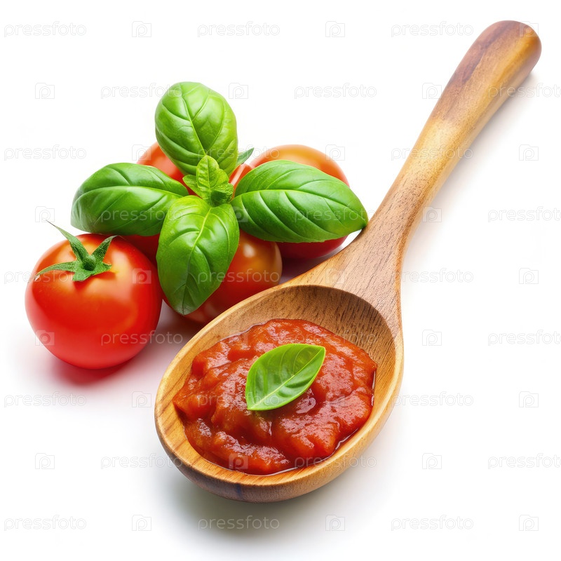 Деревянная ложка томатного соуса, украшенной свежим базиликом и спелыми помидорами