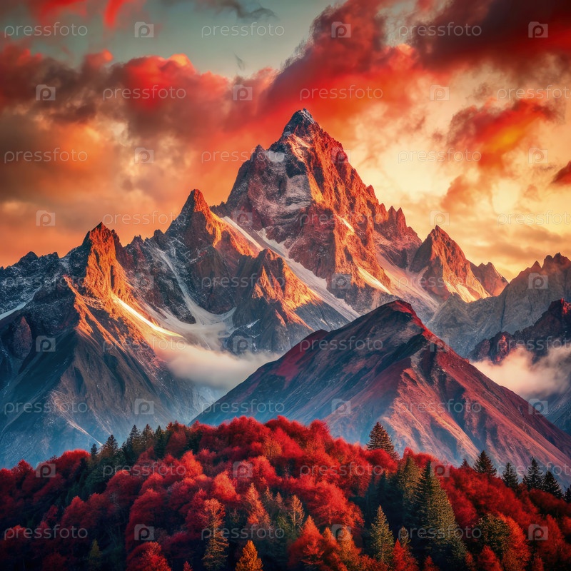 Яркий закат солнца, освещающий красные горы и осенние листья в спокойном пейзаже