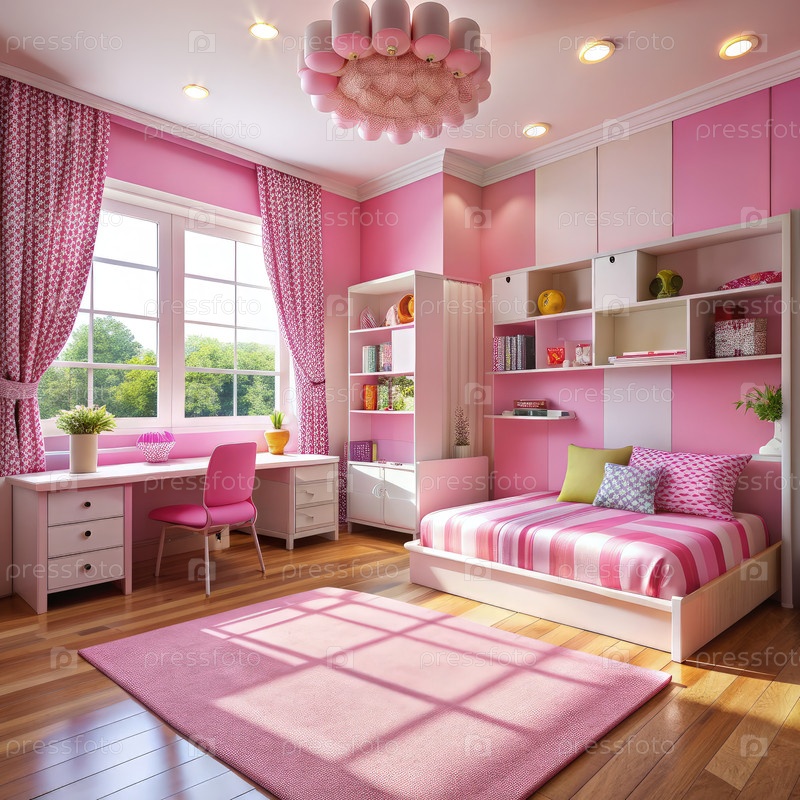 Красиво оформленная розовая детская комната с уютным постельным бельем, элегантными шторами, рабочим столом и большим количеством естественного света, заполняющего пространство