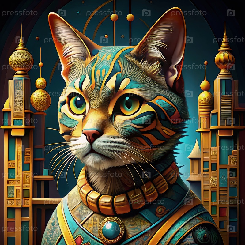 Живая иллюстрация поп-арта царской кошки, украшенной сложными узорами на фоне изящного мистического фона с возвышающимися структурами