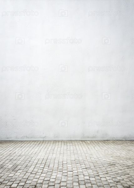 Простая белая бетонная стена с мощеным камнем на полу в пустом пространстве