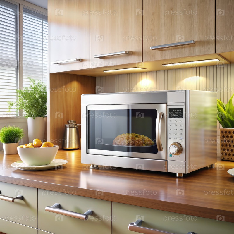 Современная микроволновая печь на кухонной столешнице с свежими продуктами питания