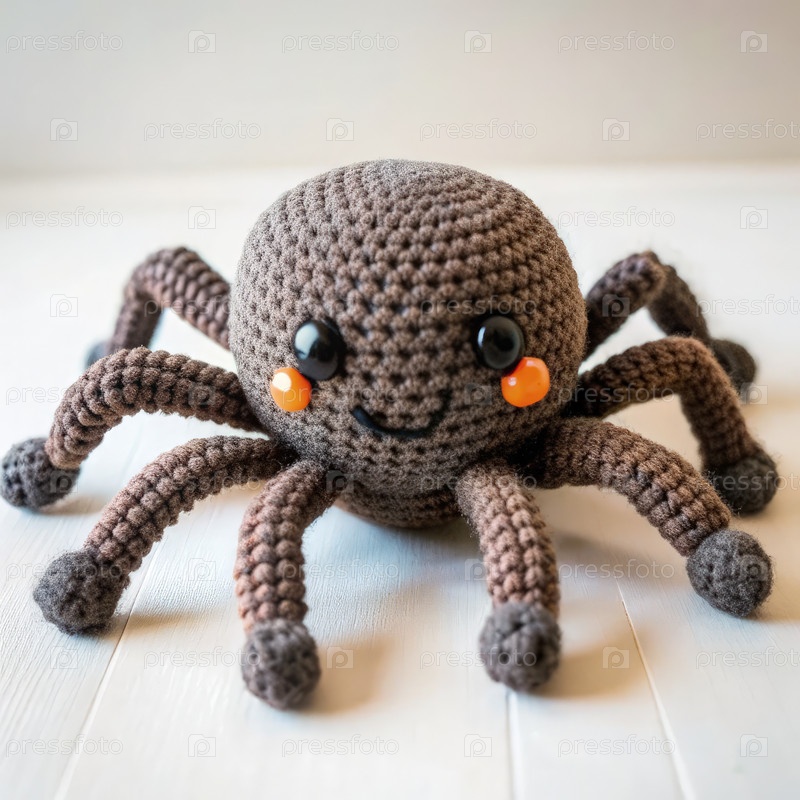Игрушечный паук Амигуруми с дружелюбным лицом и восемью мягкими ногами в уютной помещенной обстановке