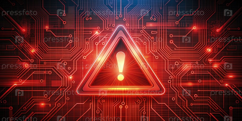 Абстрактное неон-красное предупреждение об опасности с высокотехнологичными стандартами безопасности на фоне цифровой схемы