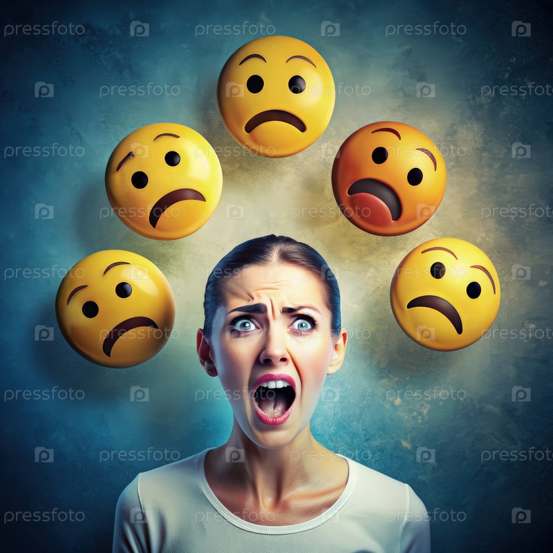 Женщина, демонстрирующая сильные негативные эмоции в окружении грустных смайликов