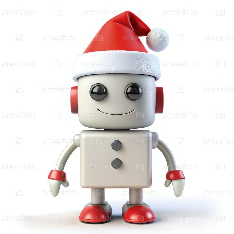 Веселый Рождественский талисман-робот в праздничной красной шляпе и перчатках, распространяющий радость от праздника в минималистическом стиле на белом фоне