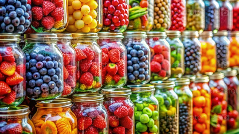 Живое отображение красочных свежих фруктов, организованных в стеклянные банки на фермерском рынке во время солнечного осеннего дня