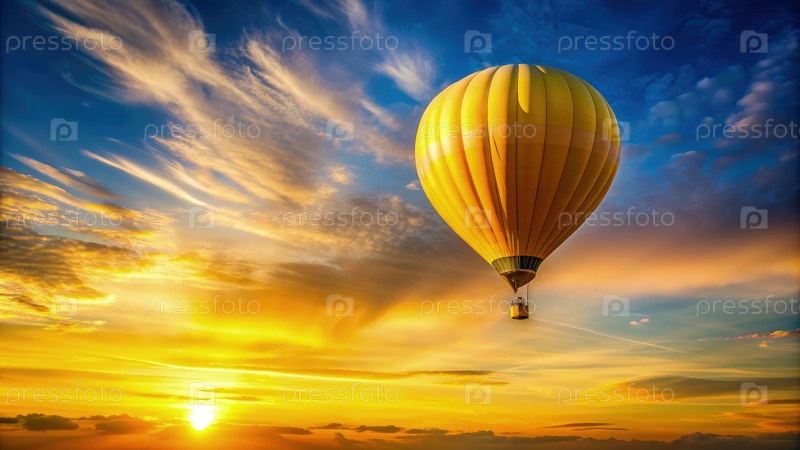 Вибрирующий желтый воздушный шар взлетает над золотым закатным небом в теплом вечернем свете