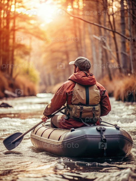Путешественник гребет паковым кораблем по лесной реке во время захода солнца