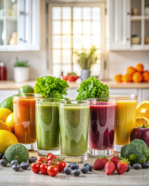 Красочный массив свежих смузи, готовых к программе детоксикации в яркой кухне