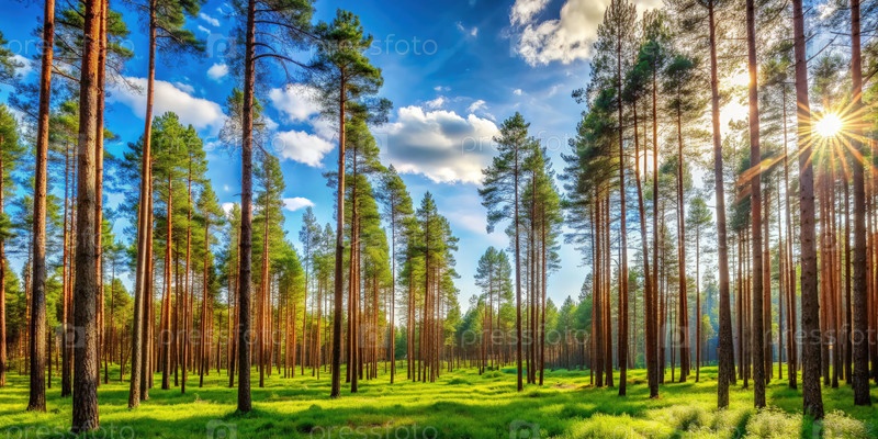 Солнечный летний день в высоком сосновом лесу с яркой зеленой травой