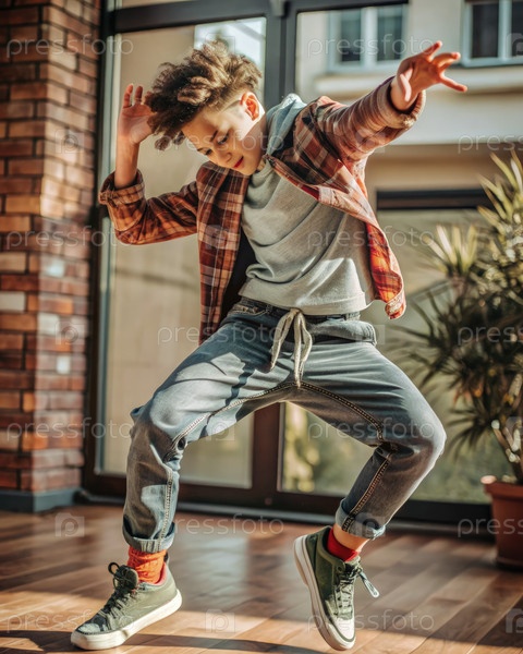 Мальчик-подросток, танцующий энергично в помещении в повседневной одежде днем
