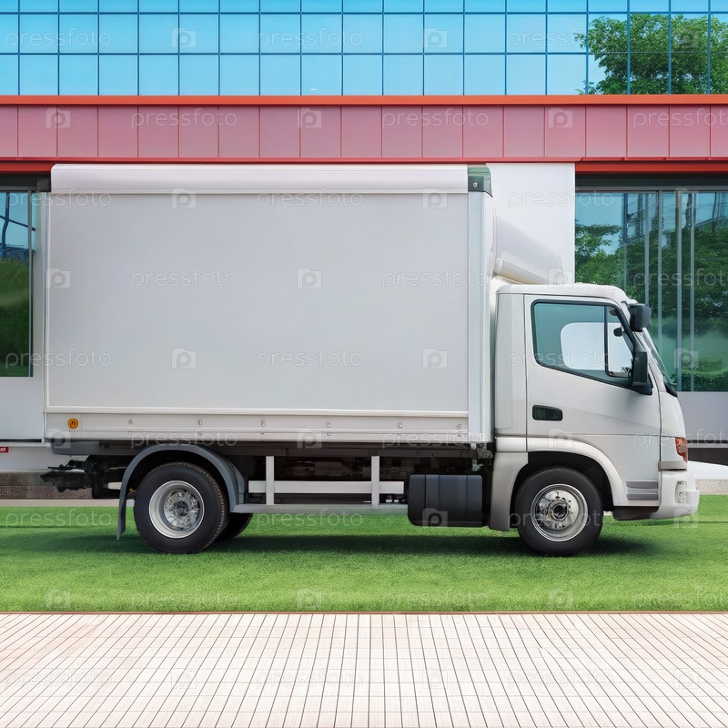 Грузовик доставки, припаркованный у здания электронной коммерции в дневное время