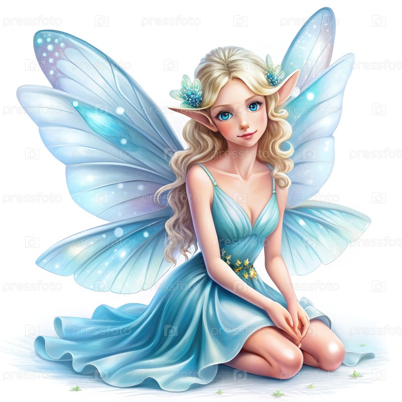 Спокойная фея с голубыми крыльями, грациозно сидящая на мягком фоне