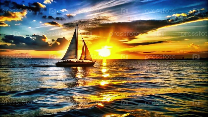 Спокойный закат солнца на воде с парусной лодкой, ползущей по горизонту