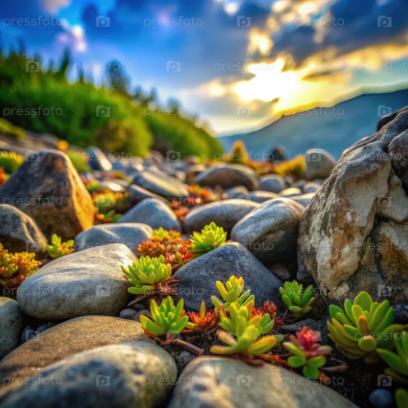 Скалы, украшенные яркими растениями при закате солнца в спокойном пейзаже