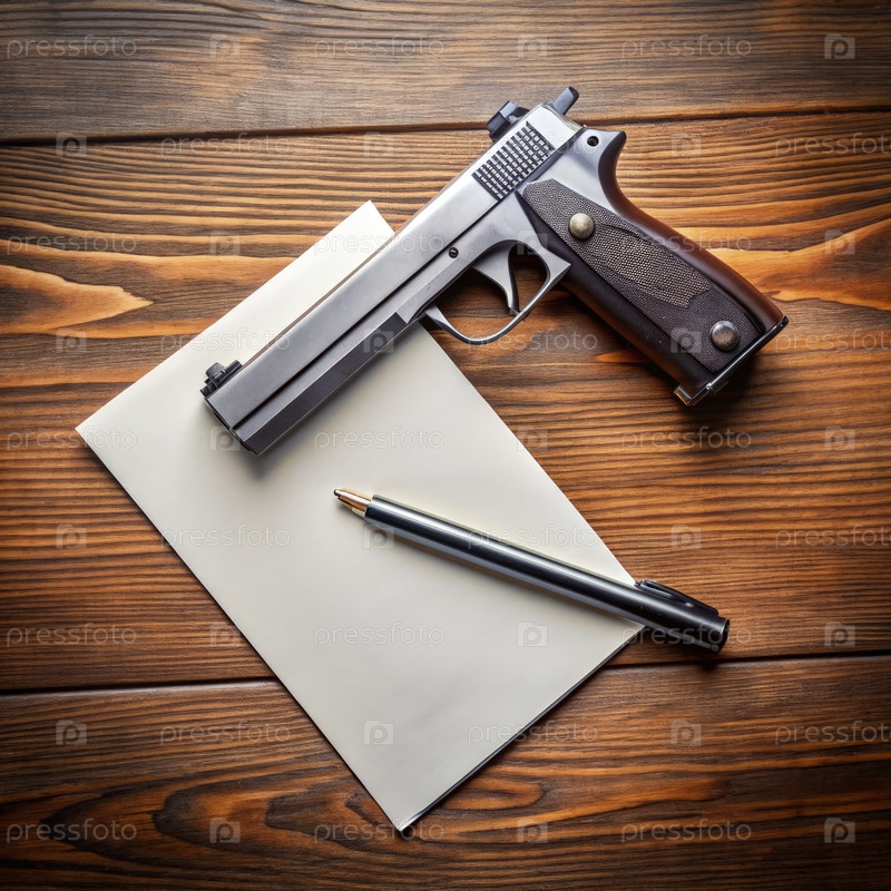 Оружие и карандаш на деревянном столе с куском бумаги