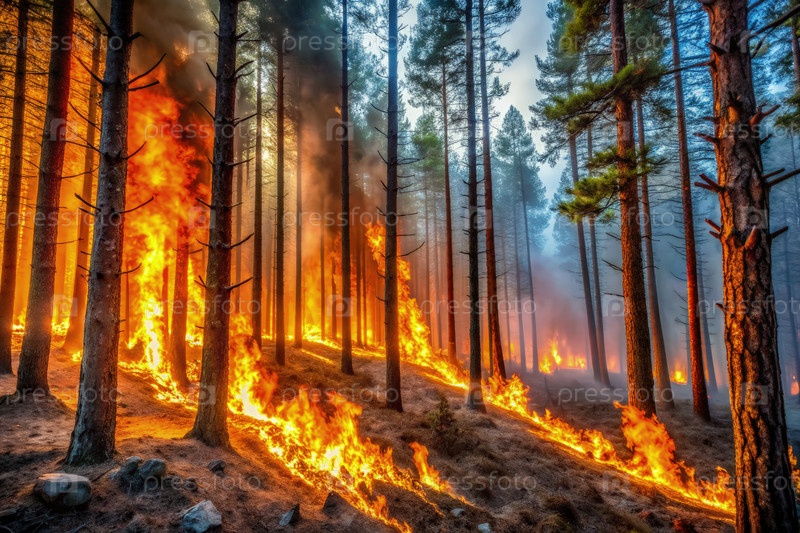 Лесной пожар, пылающий среди деревьев днем в лесистой местности