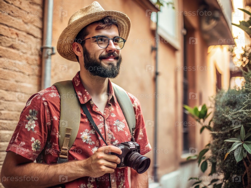 Молодой человек исследует город, держа камеру в оживленной атмосфере на открытом воздухе