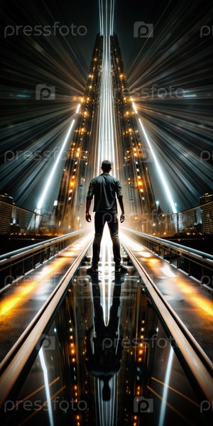 Одинокая фигура стоит на отражающейся дорожке, освещенной яркими огнями, символизируя путешествие мотивации и вдохновения в динамичной городской среде