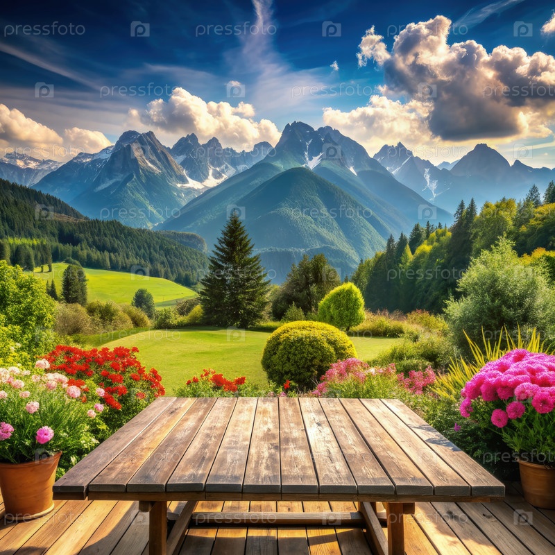 Спокойный сад с яркими цветами и деревянным столом с видом на величественные горы под ярко-синим небом