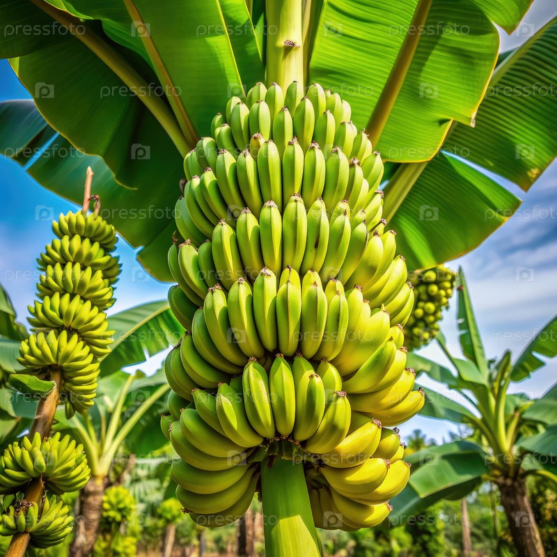 Зеленые бананы, растущие на тропической плантации под чистым голубым небом