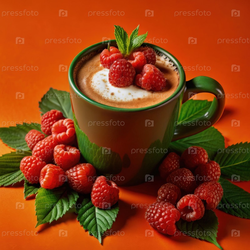 Парущая кружка кофе, покрытая пеной и свежими малинами в окружении зеленых листьев на оранжевой поверхности