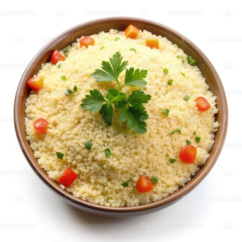 Свежеприготовленный кускус, украшенный травами и овощами в миске