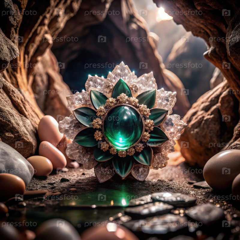 Увлекательный драгоценный цветок, окруженный природными элементами в спокойной пещере
