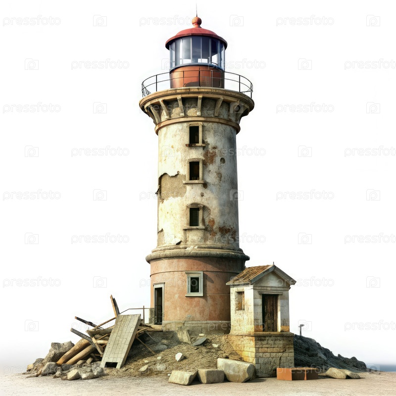 Маяк с поврежденной структурой на каменистой земле при закате солнца