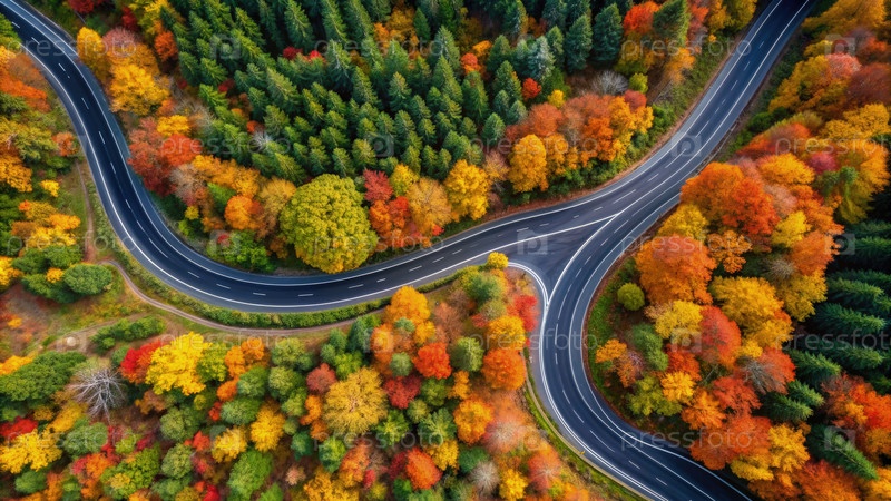 Осенние цвета вдоль извилистой дороги, захваченной сверху