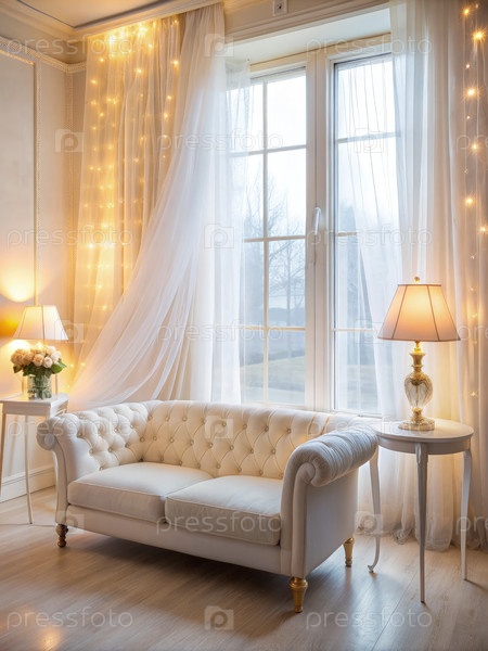Уютная и элегантная белая комната с туфтовым диваном, мягким освещением окружающей среды и окном, украшенным драпированными шторами в теплой и гостеприимной атмосфере