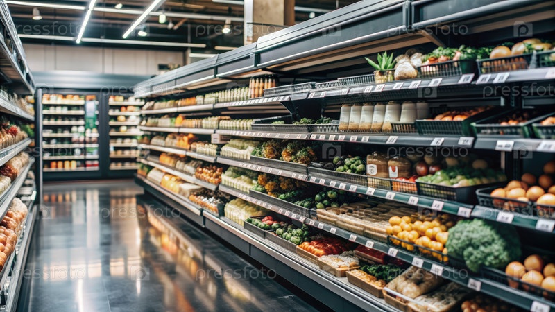 Проходы супермаркетов заполнены свежими продуктами и продуктами питания в начале дня